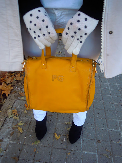 . . . Y para rematar este look tan lady chic: bolsito mostaza, a juego con el ya mencionado forro del abrigo y botines negros.