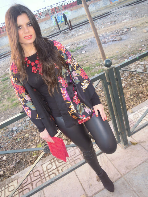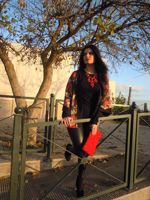 Leggins de vinilo, botines negros, clutch y maxi collar de piedras rojas completan el look.